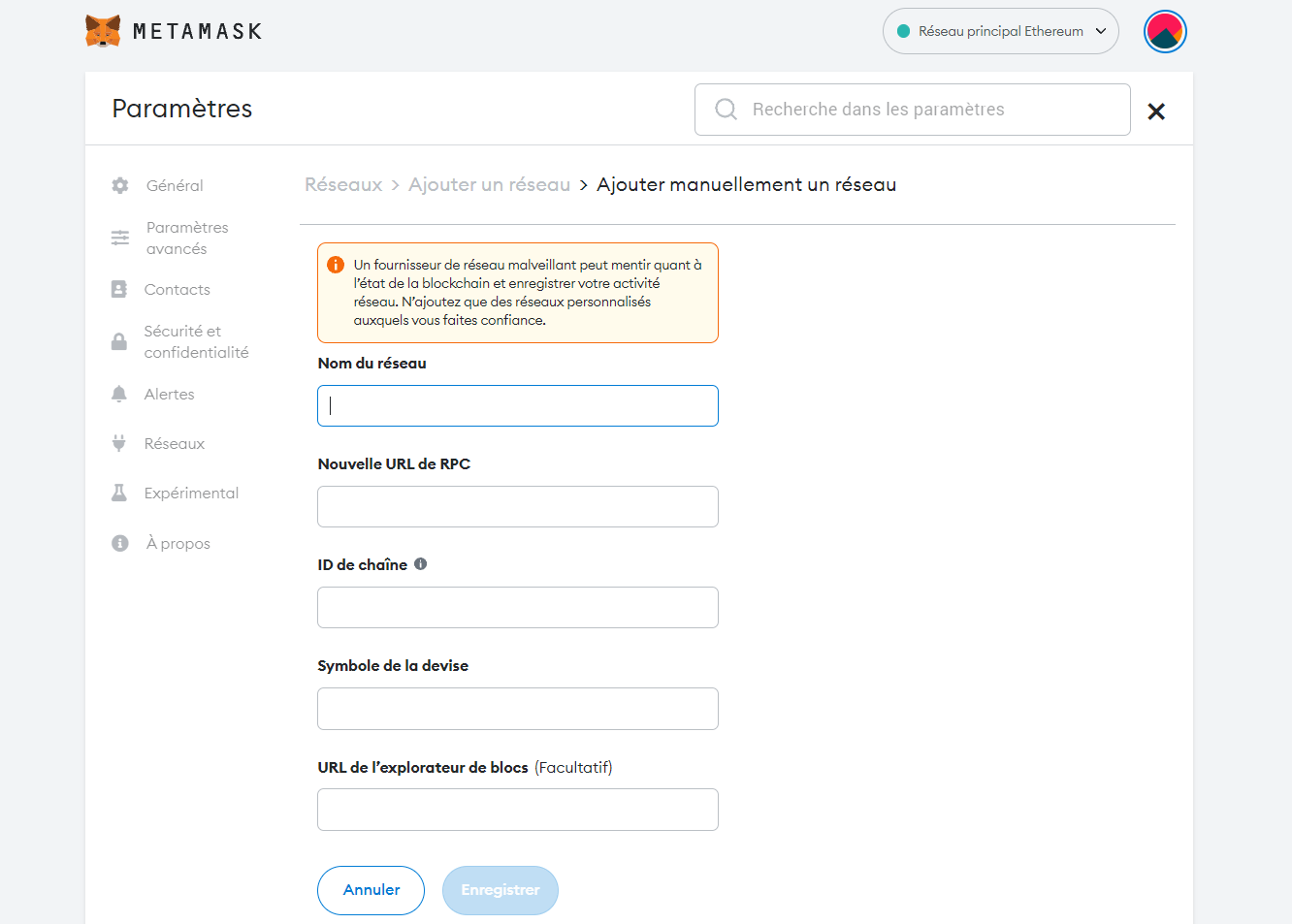 Vous devrez ensuite, vous munir de certaines informations concernant la blockchain que vous souhaitez ajouter : le nom du réseau, l’url du rpc, l’id de la chaîne ainsi que le symbole de la devise. Des informations que vous pourrez trouver directement sur le site de Metamask ou sur Chainlist.
