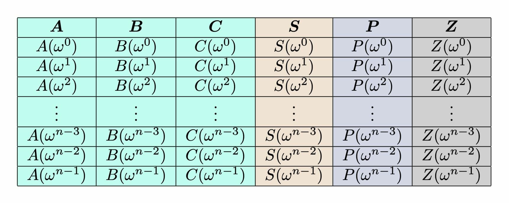 Cette colonne est donc un vecteur de dimension n composé d’éléments finis. Il représente la « forme d’évaluation » du polynôme de degré n – 1 : le i-ème élément de la colonne A correspond à la valeur du polynôme A(wi).