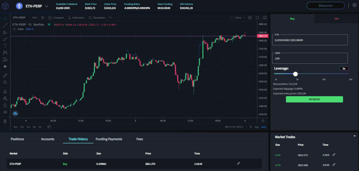 Dans le cas des contrats perpétuels de Bonfida (Audaces Perps), tous les échanges sont réalisés directement sur la blockchain de Solana, de manière décentralisée, entre les wallets des utilisateurs. Le prix du sous-jacent est déterminé grâce à un oracle.