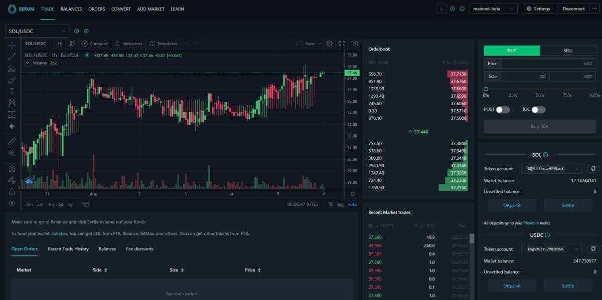Le Serum DEX connaît un grand succès depuis sa création, et le volume quotidien échangé avoisine les 32 millions de dollars. Les ordres de trading sont exécutés entièrement on-chain grâce au débit de transactions très élevé de Solana (50 000 tps). Le trader bénéficie aussi de frais très faibles.