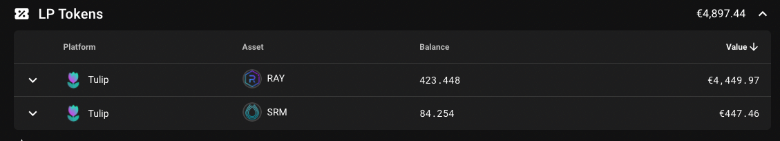 Sonar Watch vous permet de suivre en un clic les différents dépôts que vous auriez effectués, et de voir leur valeur évoluer avec le temps. Par exemple, voici un placement sur le protocole Tulip Protocol : des Raydium (RAY) et des Serum (SRM) sont déposés à disposition du protocole, lequel me rémunère pour le prêt consenti : actuellement la demande étant très importante, le taux pour les RAY déposés fluctue par exemple entre du 60% et du 95% de rendement estimé à l’année (mais ne perdez pas de vue que ce taux varie en permanence, aussi bien à la hausse… qu’à la baisse !).