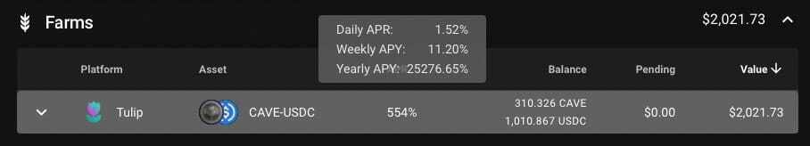 Par exemple, si vous utilisez un protocole Solana comme Tulip Protocol ou Orca, vous pourrez fournir des liquidités à part égales (1:1) sur des paires de cryptomonnaies, et être rémunérés pour ça. Par exemple, voilà un pari que j’ai pris ces derniers jours sur la paire CAVE-USDC du NFT en vogue Crypto Cavemen Club : contre le dépôt de 1000$ de CAVE et de 1000$ d’USDC, j’ai pu tenter de profiter d’un rendement délirant d’1,52% par jour. Ces investissements sont alors directement consultables dans Sonar Watch.